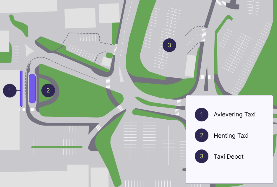 Området som det enkelte transportforetak tildeles for drift av sin tjeneste fremkommer av kart under. Transportforetaket skal ikke overskride sitt tildelte område, og eventuelt behov for utvidet areal skal skriftlig kommuniseres til Fast Travel per e-post. Området skal kun benyttes for avtalte, tjenestemessige formål tilknyttet transportforetakets virksomhet.